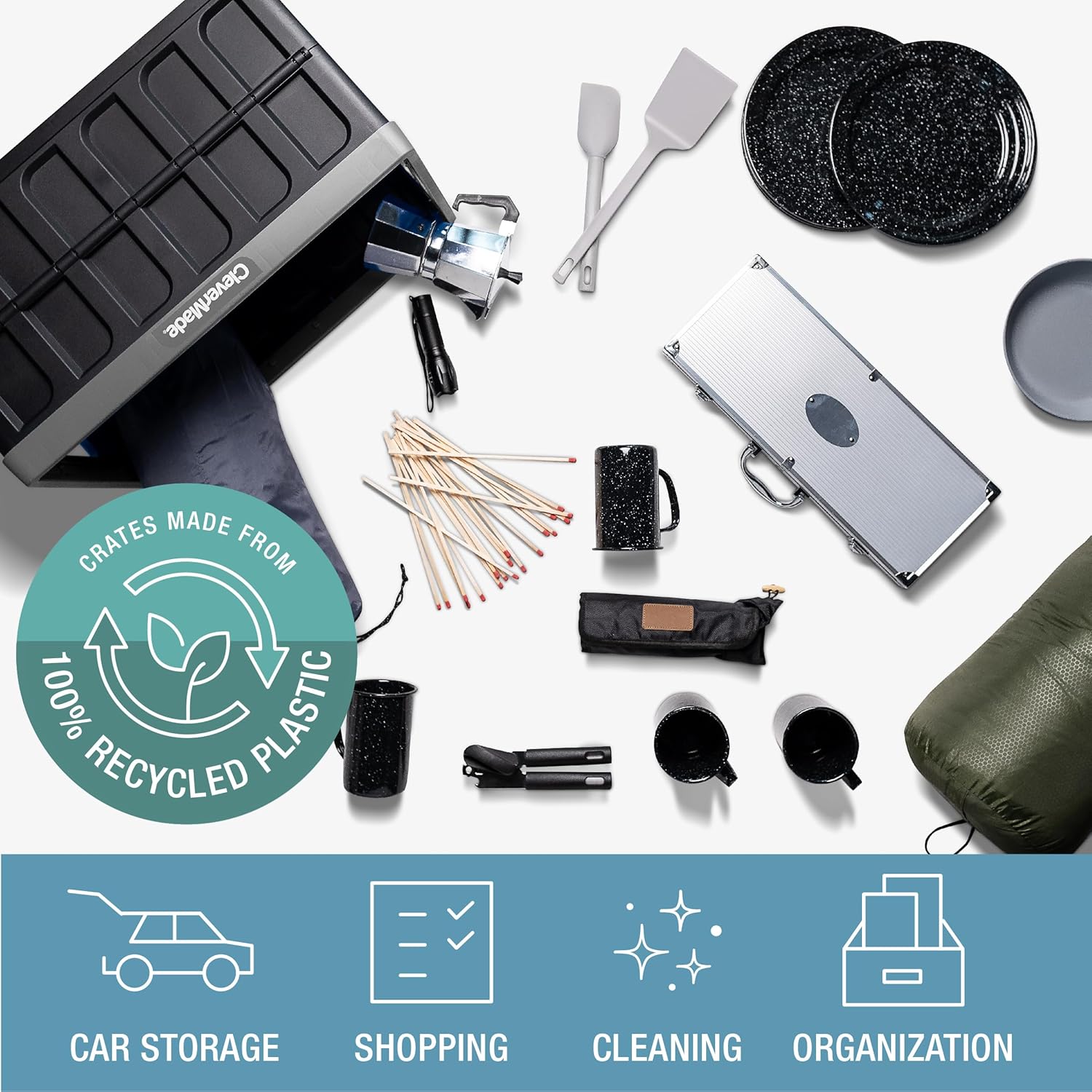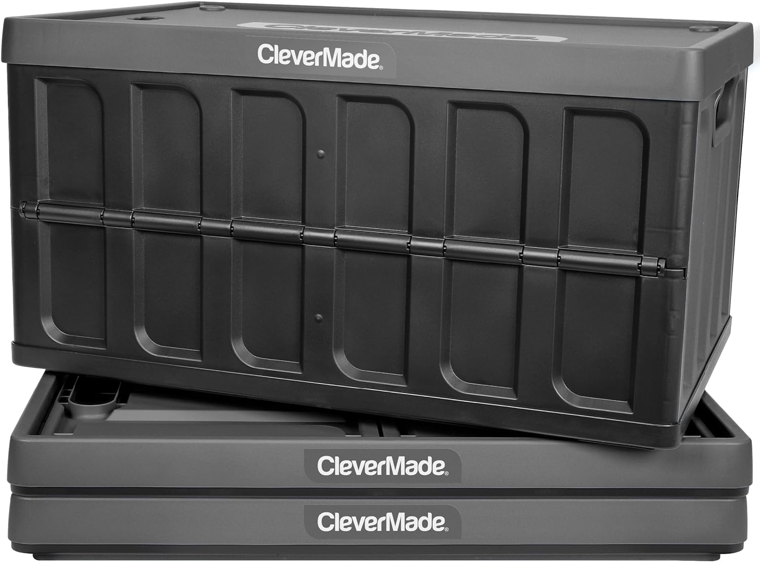 The CleverMade collapsible & stackable plastic storage crate with lid is a smart, space-saving solution to simplify all of your activities, trips and day-to-day tasks. Pop 'em open when you need them, fold 'em Flat when you don't. Clevercrates combines packing, transport and storage into one reusable, collapsible container. This brand new model includes a slimmer profile, revamped aesthetics, ergonomic handles, and a lid that can be locked on the base or secured to the top of crate when not in use. These all-purpose utility crates can also increase the ease and efficiency of daily tasks and storage, both indoors and out. Try them out for wholesale club shopping, grocery runs, storing sporting equipment, arts and crafts, gardening, and home improvement projects. Measuring 20.95" L x 13.75" w x 11.2" H when open, it holds 46 liters (48 quarts) by volume, with a maximum load capacity of 75 pounds. It features a sturdy bottom base with solid walls, making them ideal for heavy-duty projects. Comfortable, ergonomic side grip handles make heavy lifting a breeze. The interlocking Nesting system provides stability for vertical stacking. When not in use, it collapses down to 2.25" H for compact storage and weighs 4.7 pounds. Clevercrates are made of recyclable materials, Offering a sustainable alternative to plastic and paper bags, totes, and boxes. Clevercrates are easy to clean, simply hose off or wipe down with a wet cloth.