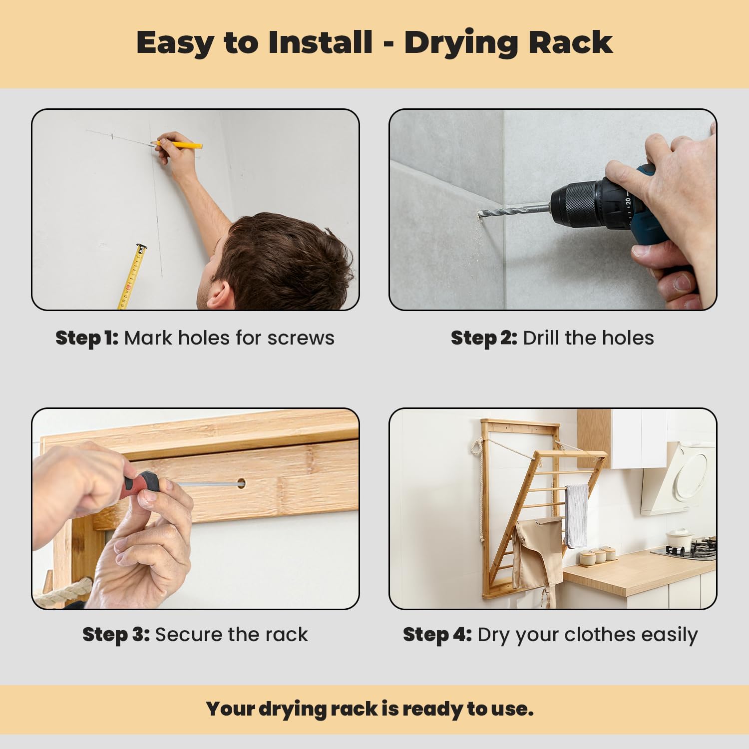 Clothes Drying Rack, Foldable Bamboo Wall Mounted Laundry Rack – Space-Saving, Drop-Down Design – 23" Wide, 40.9" High – Sturdy & Elegant for Home, Laundry Room & Bathroom