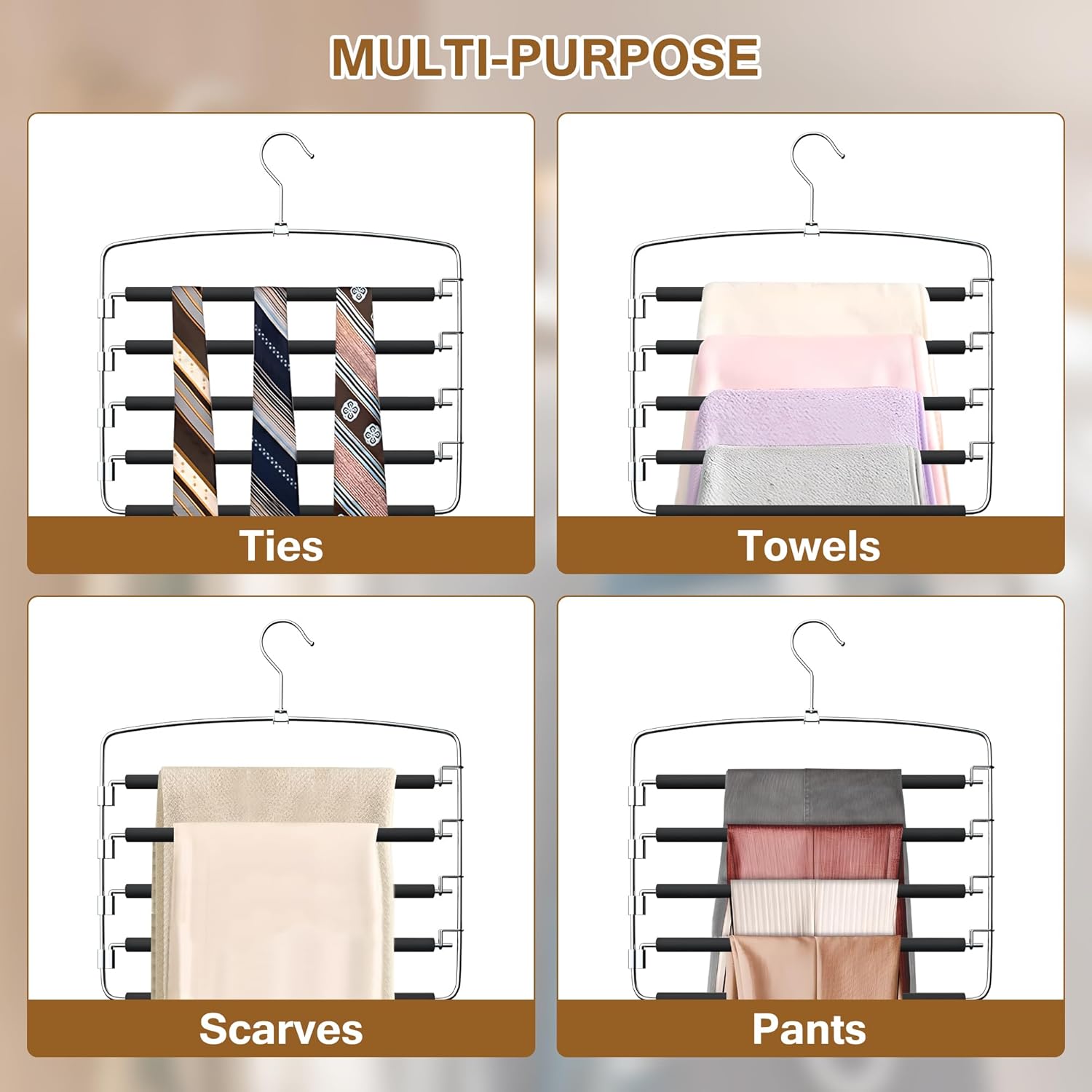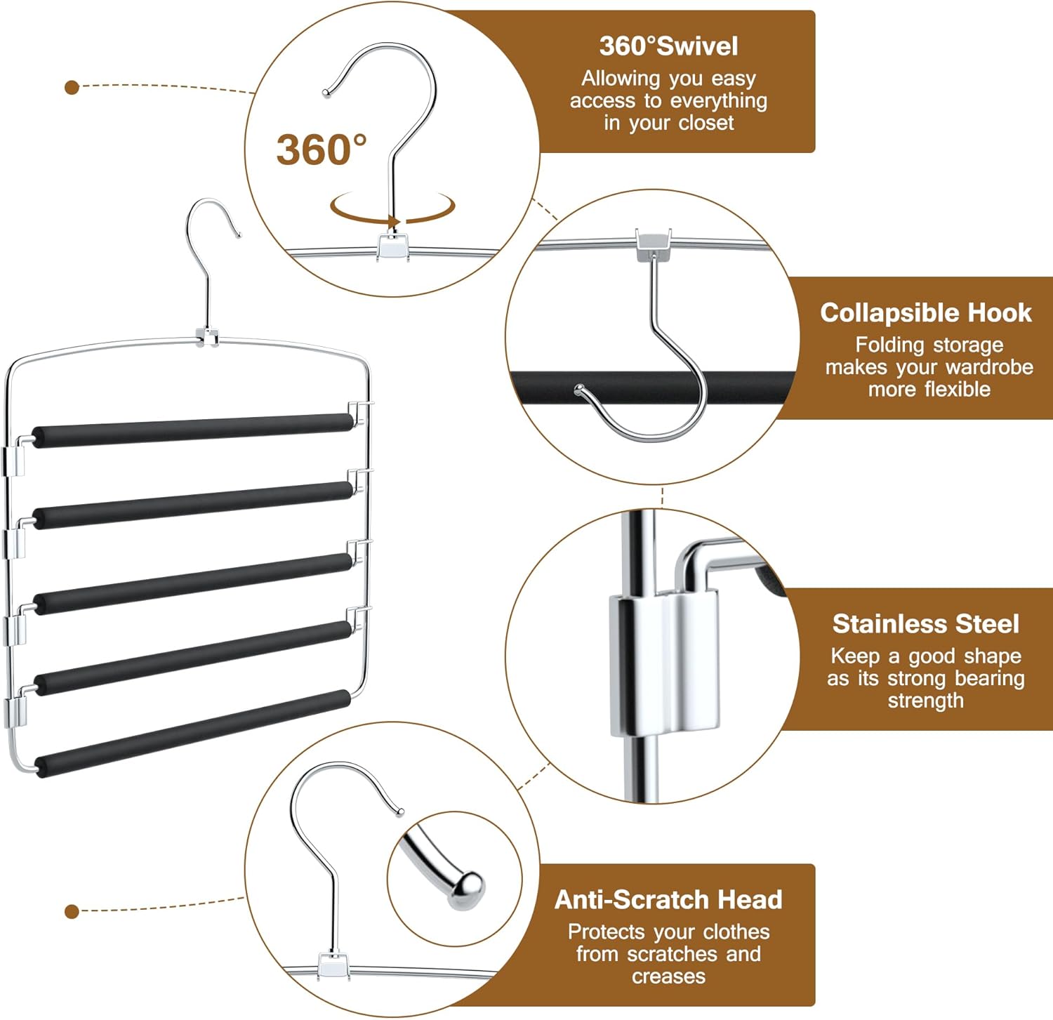 Pants Hangers, 6 Pack Anti-Slip Space Saving Hangers, 5 Layer Swing Arm Pants Hanger Stainless Steel with Non-Slip Padding, Closet Organizers & Storage for Pants Trousers Jeans Scarf